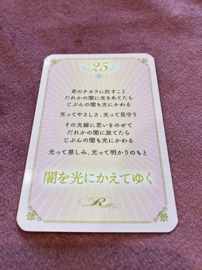 私の鑑定では、占いの最後にオラクルなどのメッセージカードを引いていただくのですが、『親愛なることづてカード』の25番に『闇を光に変えていく』というカードがあります。