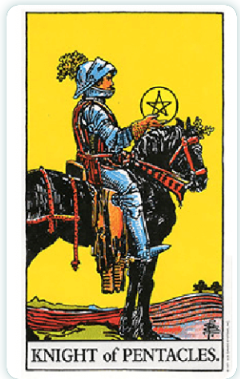 「ペンタクル」は合理性や現実的な価値観を表しており、堅実で安定を望む性質があります。ナイトは年齢的に成年期を表しています。このカードはペイジよりも、より一層着実で現実的で確実な知恵を得ることが人生に確かな実りをもたらすことを教えてくれています。ぜひご参考まで。